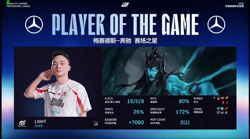 虎扑09月10日讯 在刚刚结束的WBG对阵TES的BO5比赛中,Light卡莉斯塔打出15/0/9战绩,斩获WBG对阵TES第三局MVP