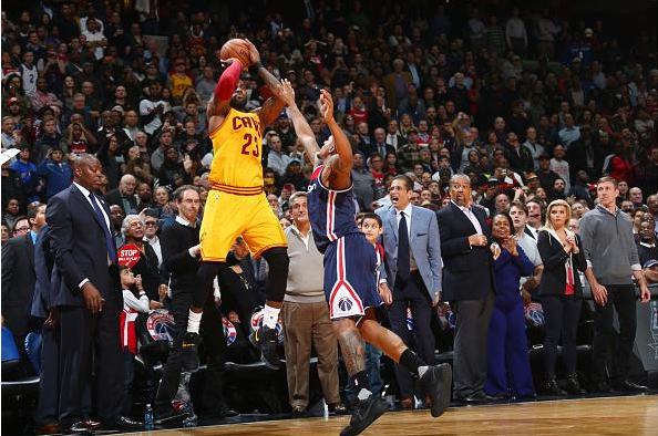 2017年2月7日奇才主场迎战骑士,詹姆斯高难度打板绝平3分命中