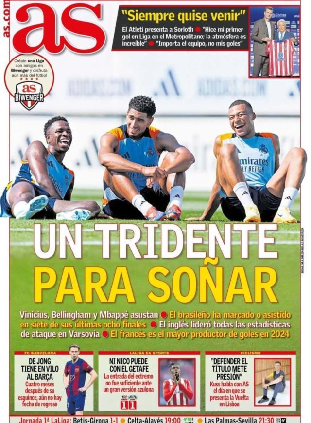 不知罗德里戈自己怎么看,他背后的亲友、助手是真替他感到委屈。就说欧洲超级杯夺冠后,《马卡》报在头版登出了姆巴佩、维尼修斯和贝林厄姆三人捧杯的照片,这其实也没什么,问题在于这张照片本来是四人合照,边上还有罗德里戈,结果却被《马卡》小编生生裁掉!而在欧超杯赛前前瞻,《阿斯》报的头版也是BMV在训练场的同框照片,标题是:“梦寐以求的三叉戟”!